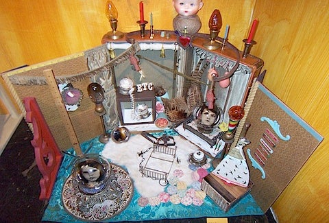 Though paper and cardboard were the classic materials for Toy Theaters, which hit their stride in Victorian times, you’ll see just about anything used in this seismic show of “Great Small Works”: machine parts, repurposed plastic toys, wire, photomontage, cloth, and (my favorite) old suitcases which house entire elaborate productions. To offer a sense of the diminutive dramatic delights in store for viewers, my eldest loved a stage crafted in the middle of an elegantly dressed giant victorian doll, I adored a Rube Goldberg-esque construction recreating the tale of Hans Andersen’s Little Mermaid, and my toddler went gaga for a goofy piece wherein Bunny Bun Bun explores a topsy-turvy apartment in search of the resident hard-boiled (Easter?) egg.