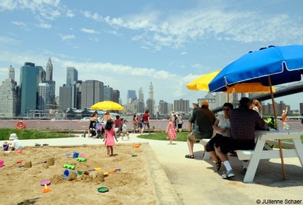 The brand new Brooklyn Bridge Park's Pier 1 is the urbane Brooklyn Heights version of Water Taxi Beach with a big sandbox (toys provided, plus grassy knolls, and umbrellaed picnic tables. Let your kids play while you suck down a brew, chow and enjoy the breeze and great views of Manhattan, the Brooklyn Bridge and Olafur Elaisson's Waterfalls. Open until 10PM through September 28th, there's even a shuttle bus from the Brooklyn Heights train stations, or just walk over the Brooklyn Bridge to make it the perfect evening.