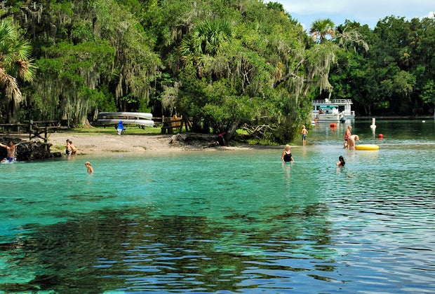 This park’s history dates back over 6,000 years, serving as a home of the Mayaca Native Americans. Enjoy the designated 72-degree, 500-foot spring-fed swimming area, which overlooks Spring Garden Run. The depth at this Florida spring ranges from a shallow 18 inches to 30 feet at the spring boil. Be sure to bring snorkeling gear to explore below-the-water artifacts. Other amenities include nature trails, a fishing pier, boat tours, picnic pavilions, playground, and a visitor center with exhibits and a touch table. NOTE: There are no lifeguards on duty at this swimming hole.