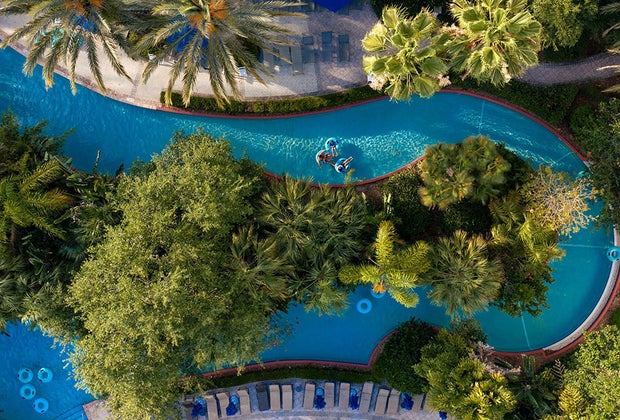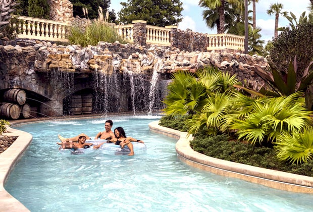 The 850-foot-long lazy river at Omni Orlando Resort at ChampionsGate boasts water cannons, hidden canyons, gentle rapids, and a waterfall. The resort also boasts a zero-entry pool, wave pool, and kids pool with tot-sized slides.