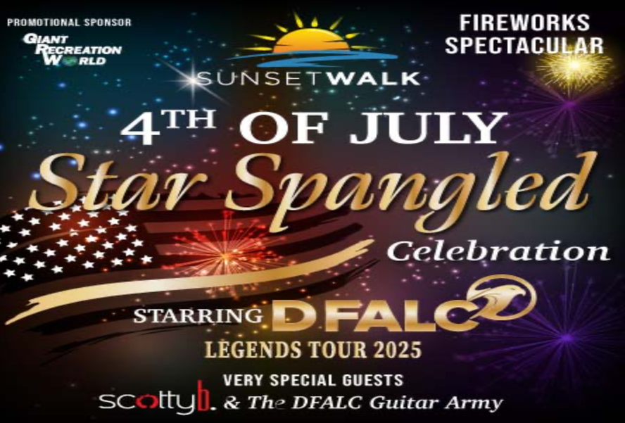Promenade at Sunset Walk invites you to the 4th of July Star Spangled Celebration starring DFALC – The Legends Tour 2025! Enjoy exciting attractions like a laser light show, confetti storm, and LED street performers. The evening concludes with Promenade at Sunset Walk’s Independence Day Fireworks Spectacular.