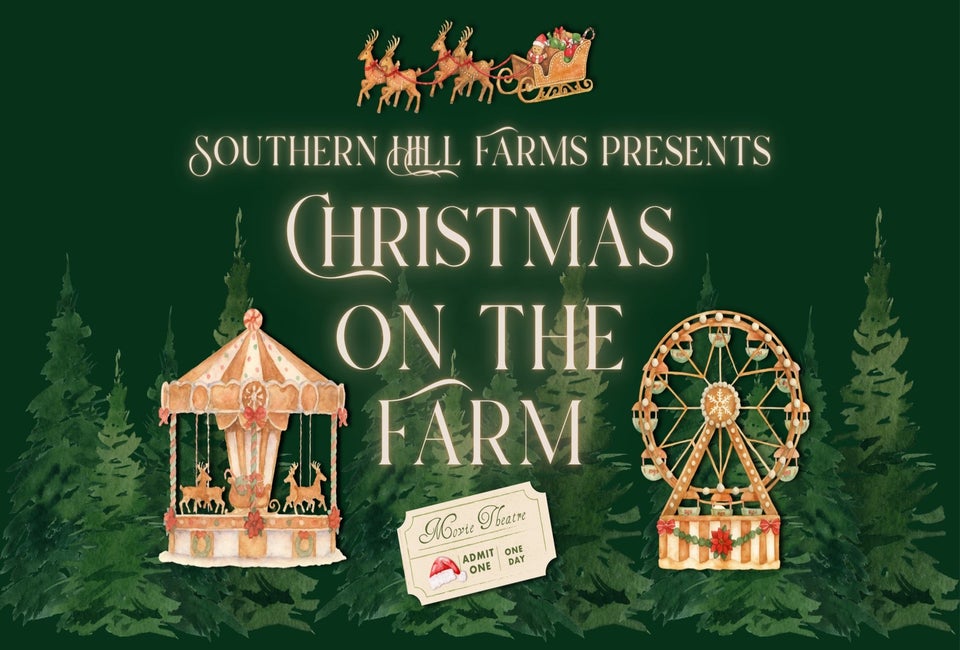At Christmas on the Farm Christmas Festival events, enjoy festive fun for the whole family, including snow showers, holiday movies, seasonal treats, Christmas shopping in the Southern Hill Farms Merry Market, and more.