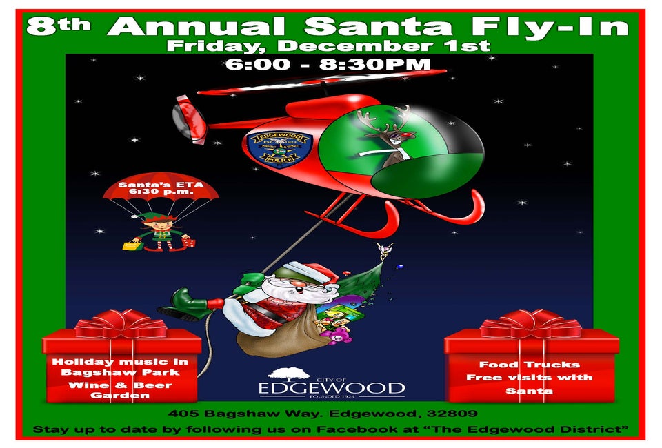 Watch as Santa arrives via helicopter (around 6:30pm) to meet his friends in the City of Edgewood. Event features Santa meet and greet, food and dessert vendors, bounce houses, Christmas lights in Bagshaw Park, holiday music, face painting, letter to Santa station, and more.