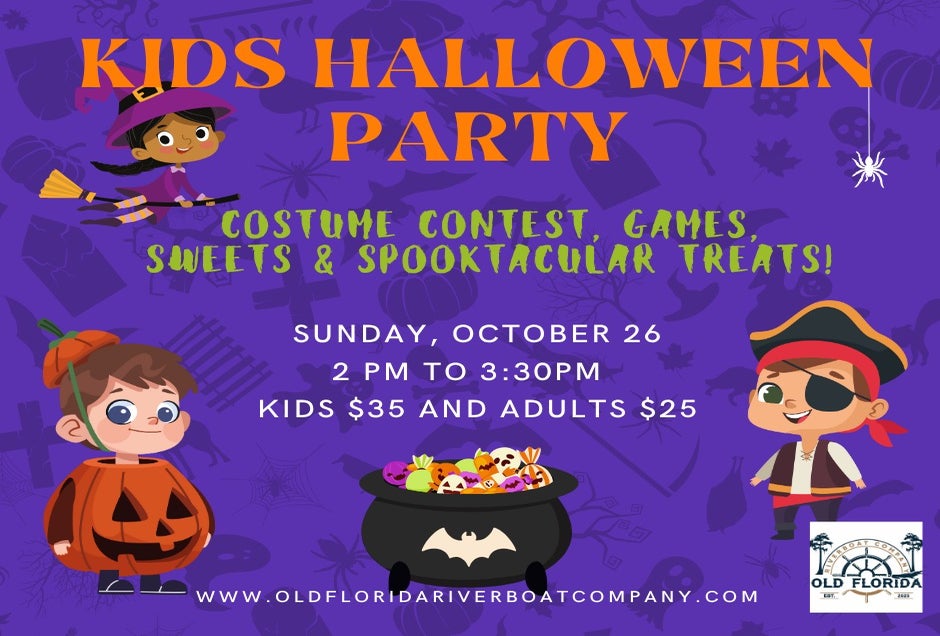 Set sail on the Old Florida Riverboat for a Kids Halloween Party. This event features a costume contest, games, sweets, and spooktacular treats!