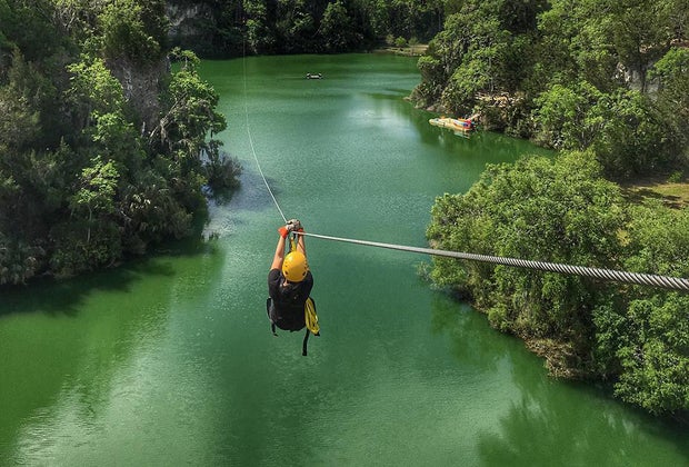 Zip line at heights of 155 feet, across plunging canyons and over spring-fed lakes. Horseback rides, gem mining, and kayaking tours are also available.