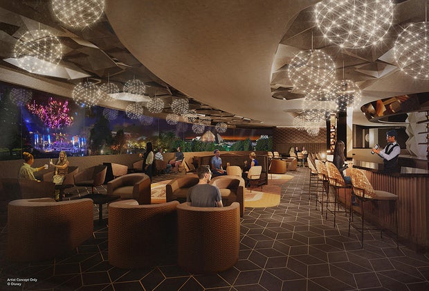 - Spaceship Earth Lounge (Epcot): This attraction-themed lounge, located behind Spaceship Earth, offers guests an elegant setting, inspired by the legacy of this theme park icon. Savor culinary creations and cocktails while enjoying breathtaking views of World Celebration Gardens and nightly fireworks. (Late spring)