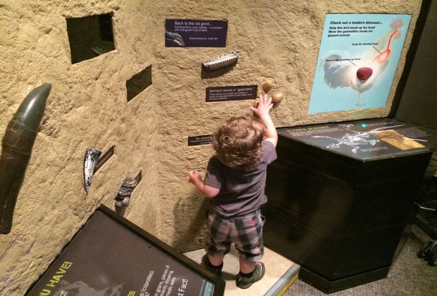 When you walk up to the main entrance, you're greeted by two life-size moving dinosaurs- a Triceratops and a 40-foot long Tyrannosaurus Rex. This exhibit is ideal for preschool age kids. My 18-month old loved the moving dinosaurs outside, but once we got into the darkly-lit exhibit itself, they were a tiny bit scary. That said, nobody was screaming or crying in fear, but he did grab on to my shirt a little tighter. It only took a few minutes for him to get used to it and by the end he was really loving it. Most kids were around 3-7 and were particularly fascinated with pressing the buttons that controlled the dinosaurs.