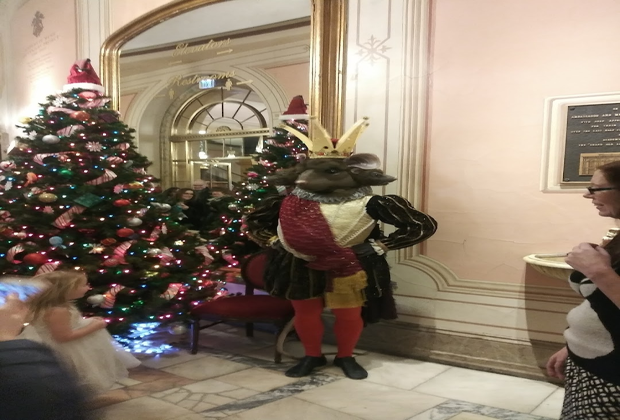 Costumes: Feathers, sequins, and tulle, oh my! Costume design Judanna Lynn runs the gamut. No detail has been overlooked. From the opening scene, we see ladies in elegant dresses and men in evening attire, donning rich hues and winter velours. As the ballet progresses we see the mice soldiers in armor cladding, wearing helmets topped with cheese (incidentally, they use their tails in place of swords to fight the toy soldiers) and the Mouse King with a bejeweled crown atop his seven heads.
