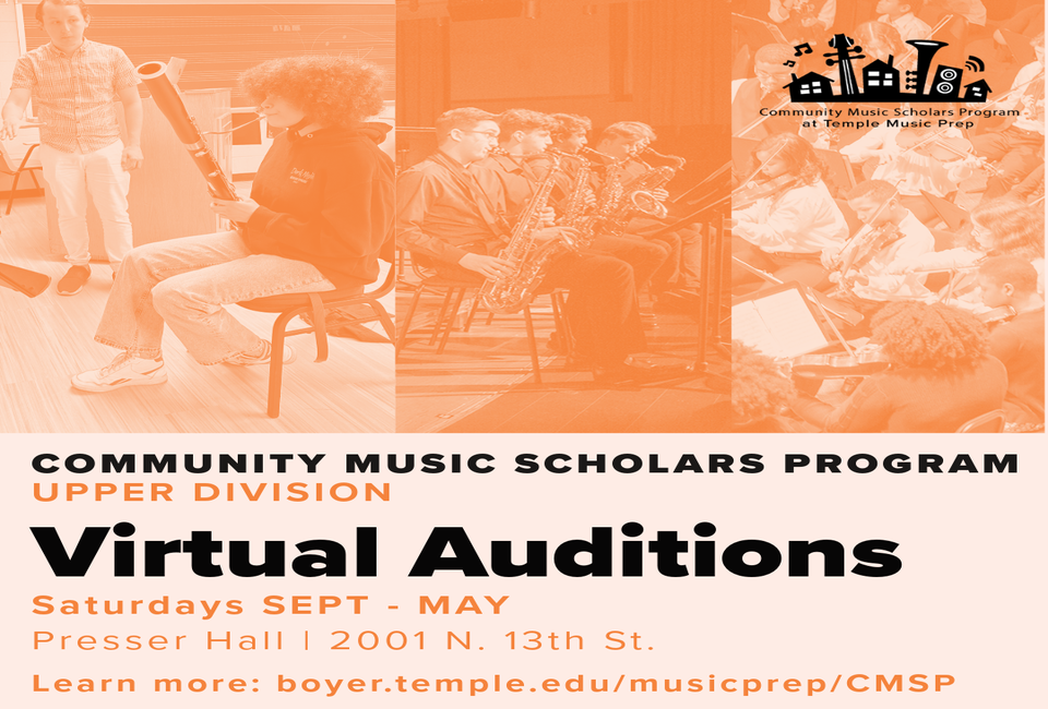 The CMSP Upper Division will be accepting virtual auditions up to September 1, 2025. There is no fee to audition, registration is required. Please visit https://boyer.temple.edu/musicprep/CMSP to view season information and find the application link.