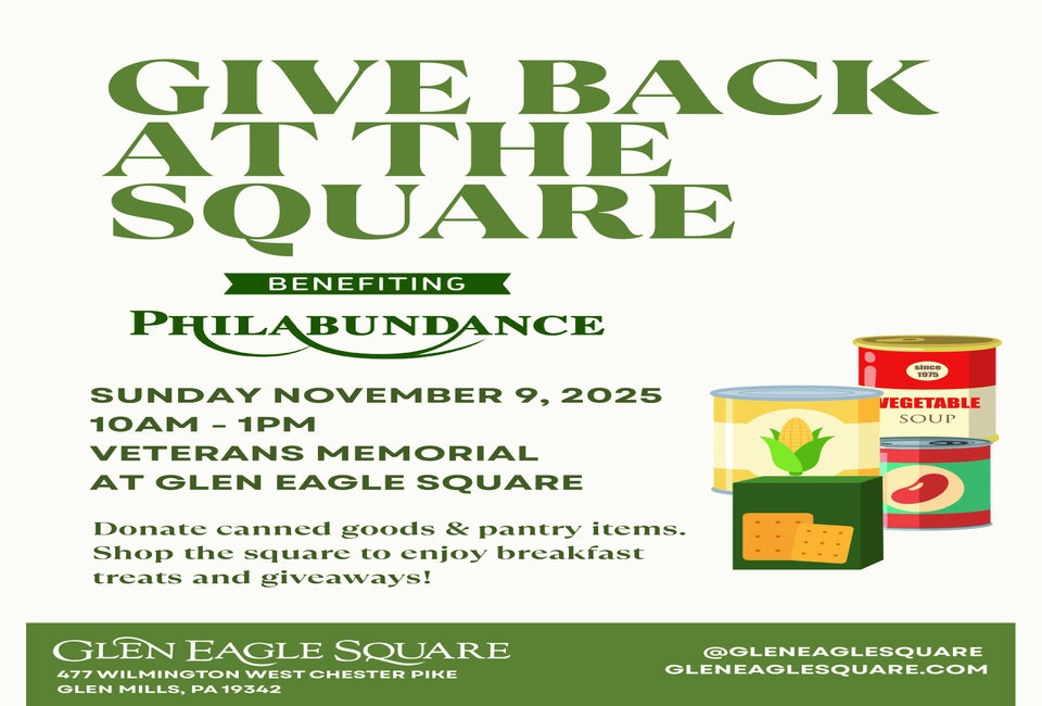 Attend a morning of community and generosity at Glen Eagle Square’s Food Drive benefiting Philabundance. Your donation of non-perishable food items will help support local families facing food insecurity.