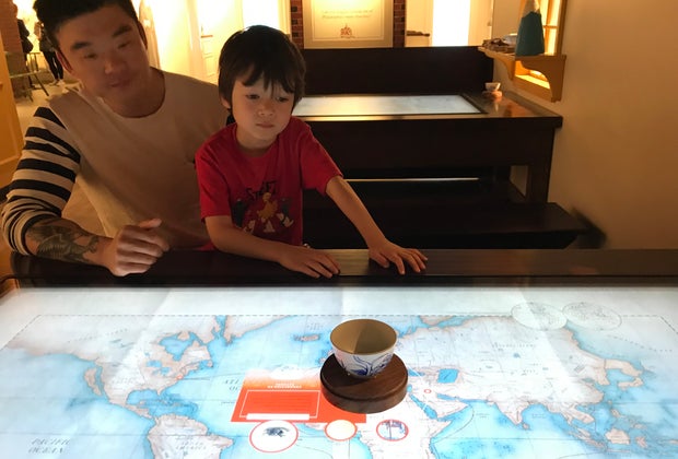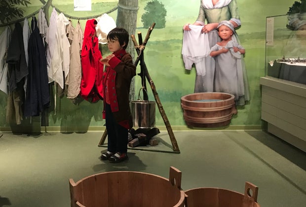 The space is definitely cool, and large, which is great for kids with energy to burn off before going through the main exhibit on the second floor. Playing in the camp was a treat for both kids, where my son dressed up as a soldier while his sister helped him “cook.” A digital touchscreen lets your young soldier enlist using a quill pen, and learn more about how enlisted soldiers were paid and clothed. Civilian and military uniforms are both available.