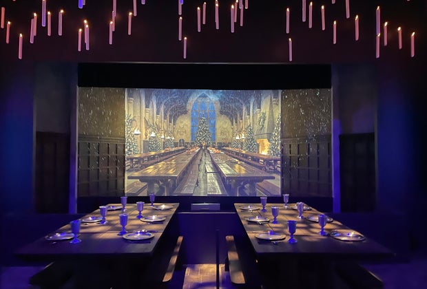 Two long tables are set before guests as floating candles flicker overhead in an enchanting representation of one of Hogwart Castle’s most important rooms. A giant screen projects key scenes from noteworthy Great Hall moments, such as daily breakfast deliveries from the owl post and the Hallowe’en Feast.