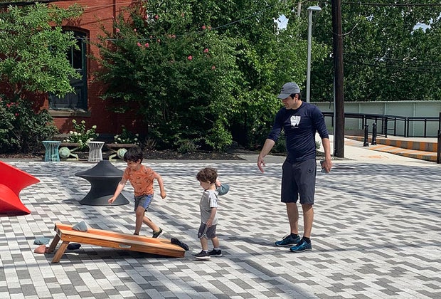 Play lawn games like corn hole while dining riverside at the Landing Kitchen. Photo by Liz Baill @creativishmom