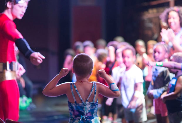 The show ended a bit abruptly and we were a little disappointed that there was no meet and greet or photo-ops with the cast aftewards. I think it would have been helpful for those who were scared to have the show demystified a bit and to see that it was all pretend. There was a particular cast member who played a fellow Hero School student whom we wanted to meet and say hello to after the show. Taysha Canales was super sweet and really amazing with the kids. If you have kids who are hesitant or scared, stick close to her during the show. Unfortunately, photo taking is not allowed during the performance, which is a shame because it's hard to resist taking photos of your kid doing something cool like this, but it was also nice to take a break from being the family paparazzi for a few minutes.