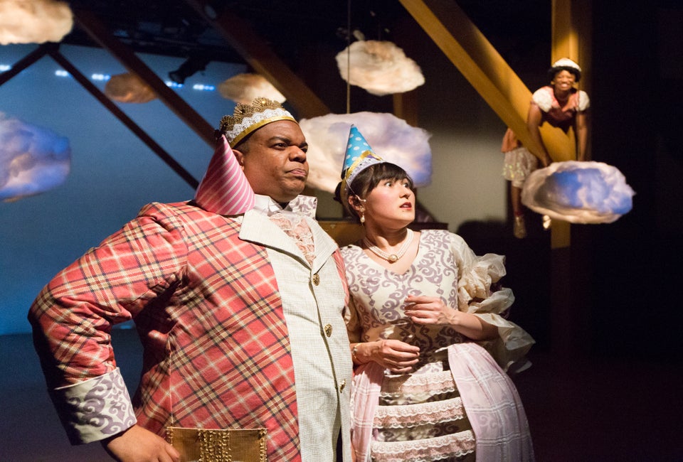 The princess' ailment of having no gravity makes her a hilarious counterpart to her very serious parents. She grows in size but not in maturity, and the kids loved it. The impression of the princess floating is given using clever staging as opposed to the use of a wire (see above photo). It may not be as strong or easy for the kids to interpret like this, but it certainly was more entertaining this way. The narrator plays to the adult audience, throwing in blips of pop culture that the kids couldn't possibly get but the parents appreciated.