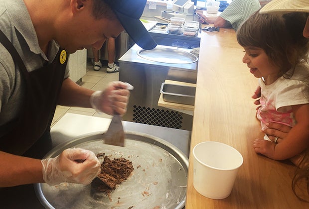 At this new shop, your Thai-style ice cream comes in flat, thin rolls as opposed to scoops. Select your flavor, from traditional to funky, including Bettigan's Unicorn, which contains Froot Loops, and watch the staff spread your treat on a cold tray. Add-ons, if you want them, are then mashed into the ice cream, which is hand-pressed flat and neatly rolled with a spatula before being placed in a cup. You can add extra toppings such as Kit-Kat or animal crackers if you wish to top off your treat. Kids will love watching the making of their creation, and the eating of it, of course!
