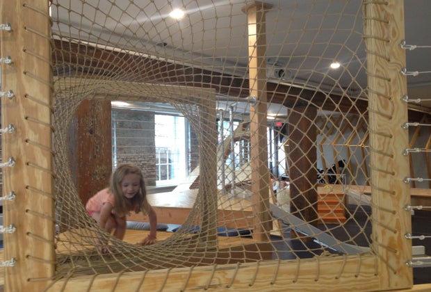 When my daughter and I visited Recess d.u.m.b.o., we met a pair of 3-year-old twins who were already on their third visit—I took that as a sign we were in for a good time. Opened by a pair of neighborhood moms in June 2015, the 2,200-square-foot play space features custom-made wooden structures that encourage kids to climb, shimmy, slide and explore. My daughter loved navigating the tunnels made from rope netting, which lead to slides in one direction and a firehouse pole in another. She found bars to swing on, hidden ladders to climb and structures to conquer. One obvious kid-pleaser: a wooden climbing wall that leads to a brass bell. Get to the top, ring the bell—incredibly satisfying!