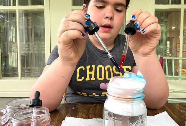 This experiment only requires food coloring, shaving cream, a glass jar, and pipettes. It's also just a fun craft project on rainy days for kids as young as preschoolers to tweens. Find more science experiments in our STEM and Science Activities Guide for Kids.