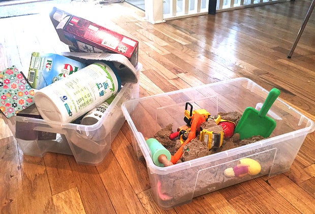 First, make sure all your toys aren't all out and available for play. If possible, find a hidden area in your house to box up some of your toys. Every couple weeks or whenever you feel a child's interest is waning, pull some toys out from storage and replace them with the toys that are currently in the play area. Next, set up some suggested areas of open play like wooden blocks, magnetic tiles, a few cardboard boxes, or some small tactile bins with things like marbles, kinetic sand, or dried beans. Throw in some scoopers or small jars and see what happens. If you have any outdoor space, filling some containers with water and some cups and ladles is a surefire way to catch toddlers interest. If possible, embrace the mess!