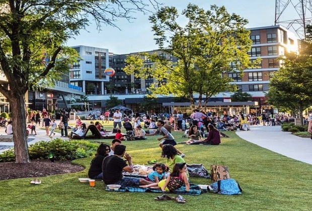 You can spend a whole day at this shopping, dining, and entertainment district and still not get bored. There are more than 30 restaurants, many of which offer outdoor seating, and nearly 30 stores, from Target and Barnes & Noble to smaller boutiques. There's also a movie theater; Muse Paintbar, which offers plenty of workshops for kids and families; Tiny Dancers, where kids ages 2-12 can take dance lessons; and more. At the center of it all is a large open area with artificial grass that's perfect for picnicking and the site of many special events.