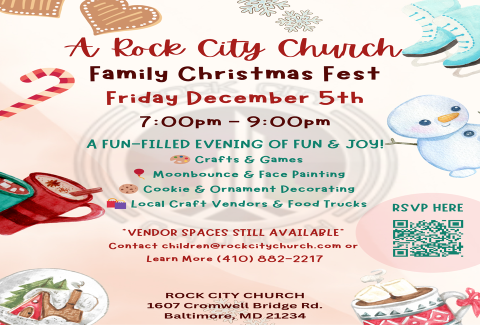Families are encouraged to RSVP and to invite friends, neighbors, and extended family to attend. For more information about A Rock City Christmas: Family Christmas Fest, or to learn more about Rock City Church, please contact children@rockcitychurch.com or call 410-882-2217.