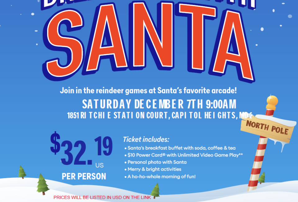 Santa Claus is coming to Dave & Buster’s Capitol Heights and joining families for an American breakfast buffet with soda, coffee, and tea. Each Santa ticket also includes a $10 Power Card with unlimited video game play, kid-friendly crafts, early access to stores, a personal photo with Santa, and 18% gratuity and taxes.