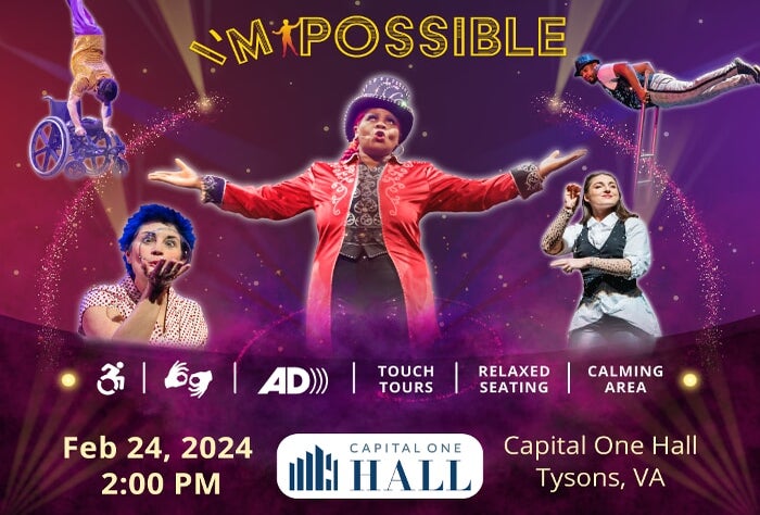 Omnium Circus's "I'mPossible" features a diverse mosaic of brilliant performers including gravity-defying aerial acts, mind-blowing contortion, unbelievable acrobatics, hysterical comedy, dazzling dancers, and more. It’s a circus adventure where there are no limits, no boundaries, and no barriers. Omnium is the only circus in the world to be presented bilingually in English and American Sign Language.