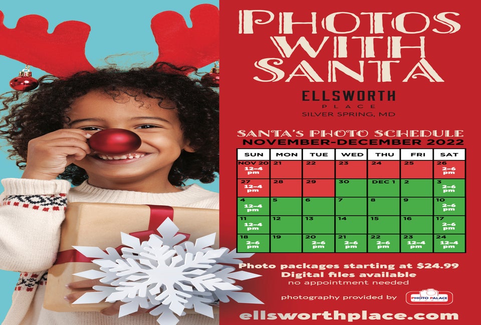 On Saturday, November 19 from 12-4, children receive one free photo with Santa. After November 19, photo packages start at $24.99 with digital files available.
