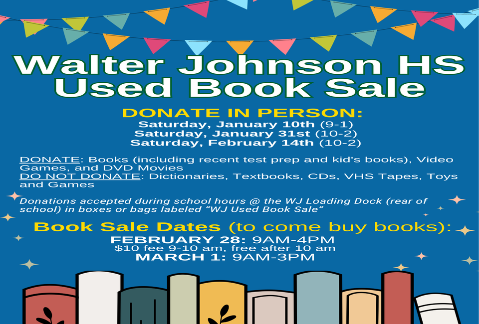 Get ready for the 2026 WJ Booster Club Used Book Sale! Make room on your shelves and bedside tables for new books by gathering up your old ones to donate to the Used Book Sale. Please spread the word to your family, friends and neighbors!