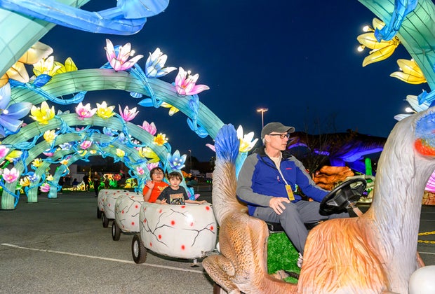 Beyond the illuminated creatures, kids can explore a dino-themed fun zone that’s packed with rides and games. Young visitors can go wild in the Jungle Explorer Playground or take a spin on the Dino Carousel, just to name a few attractions included with admissions. For an additional fee, children can hop around the Dino Bounce Castle, search for fossils and gems at the Safari Dig, climb aboard the Oviraptor Train for a memorable ride, and more.