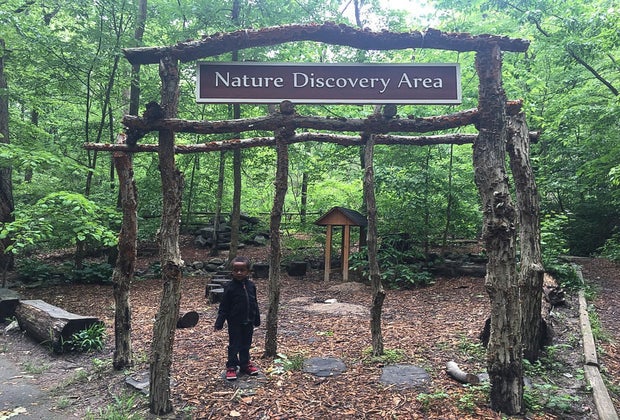 The indoor area of Hidden Oaks Nature Center features a small play structure, a reading nook, dress-up costumes, several live animals, and plenty of hands-on activities for kids. Outdoor areas include a natural play area called Nature Playce with climbable logs and rocks and things to build; ponds with frogs, turtles, and tadpoles; and a recently updated playground that is great for both young and older kids. Woodland trails wind through scenic paths with native plants and a cool tree carving.