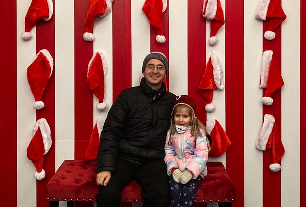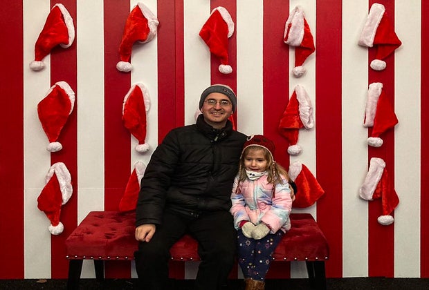 As far as pictures go, there are so many Instagrammable photo ops! We discovered a Santa sleigh with reindeer that our daughter loved sitting in. Inside one tent, there was a Christmas backdrop with red and white stripes covered in Santa hats and a glittery silver New Year’s Eve backdrop. For an extra $20, families can go inside a snow globe and take a 3-D video of themselves dancing to Christmas music in the snow.