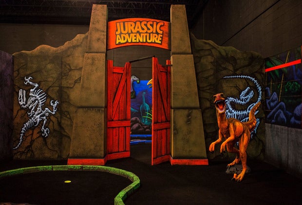 Jurassic Golf deploys the fun special effects of black lights and glow-in-the-dark lights, but instead of monsters, it has dinosaurs! The 18-hole course includes CGI effects and cool settings like underwater prehistoric creatures, a dinosaur research lab, a stegosaurus feeding ground, and—last but not least—a Tyrannosaurus rex. There's also a small arcade with 20 games and the opportunity to win prizes. Jurassic Golf is closed Mondays and Tuesdays.