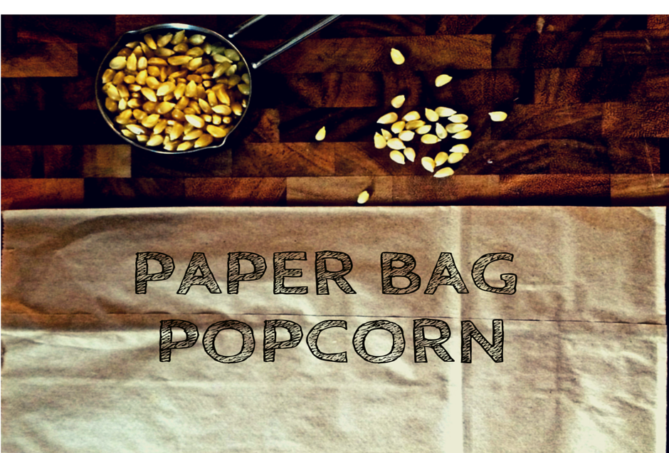 1) Pour about half a cup of popping corn kernels into the brown paper bag.