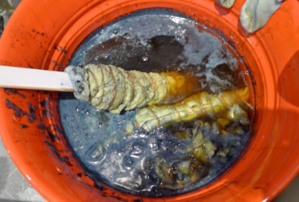 2: Prepare the dye bath and follow your dye's directions. After your items have been in the dye the recommended length of time, remove your garment. Watch it turn yellow for a few seconds as the color oxidizes and then turns the beautiful indigo blue.
