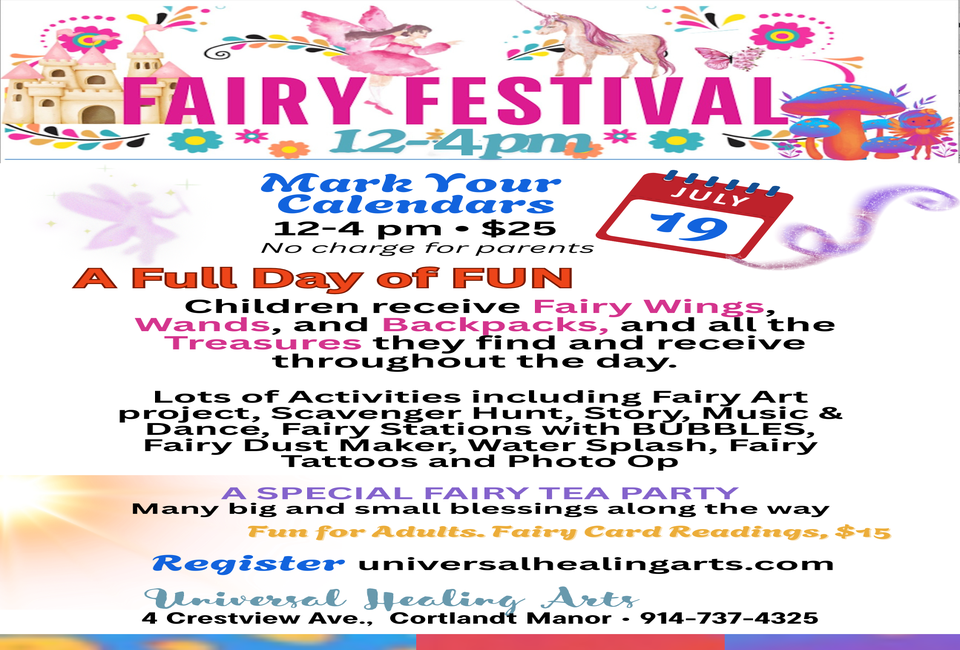 Step into a world of enchantment at the annual Fairy Festival at Universal Healing Arts, in Cortlandt Manor. This magical celebration offers a whimsical afternoon filled with fun, fantasy, and fairy-inspired activities for all ages. Guests are encouraged to dress in their fairy best and come ready to celebrate the joy, creativity, and wonder of the fairy realm.