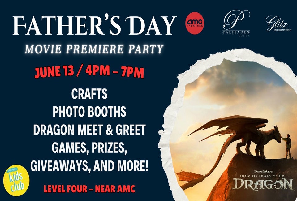 Join the Palisades Center Father’s Day Movie Premiere Party in honor of the new How to Train Your Dragon release! Families are invited to enjoy an afternoon of fun-filled activities on Level Four near AMC, including craft stations, a dragon meet & greet, games and contests, and more.