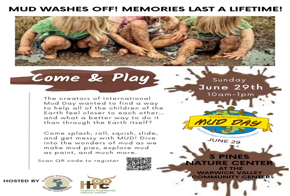 Come splash, roll, squish, slide, and get messy this International Mud Day. at Hudson Highlands Nature Center at the 3-Pines Nature Place. Make mud pies, explore mud as paint, and much more.