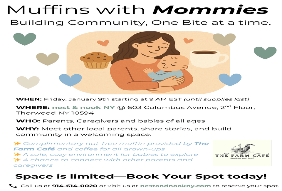Drop in for muffins with mommies at Nest & Nook in Thorwood. Taking place on the first Friday of every month, your drop-in visit will include a freshly made muffin from The Farm Cafe in Valhalla. Muffins are first-come, first-served!