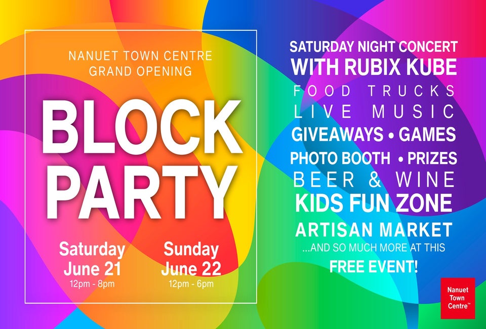 Get ready for an unforgettable weekend of fun to celebrate the grand opening of Nanuet Town Centre! Enjoy two jam-packed days of free live music, delicious food trucks, beer & wine, a photo booth, games, giveaways, a kids' fun zone, an artisan market, and so much more! Kid-approved fun includes face painting, balloon art, chalk art, lawn games, prizes, and character meet-and-greets.