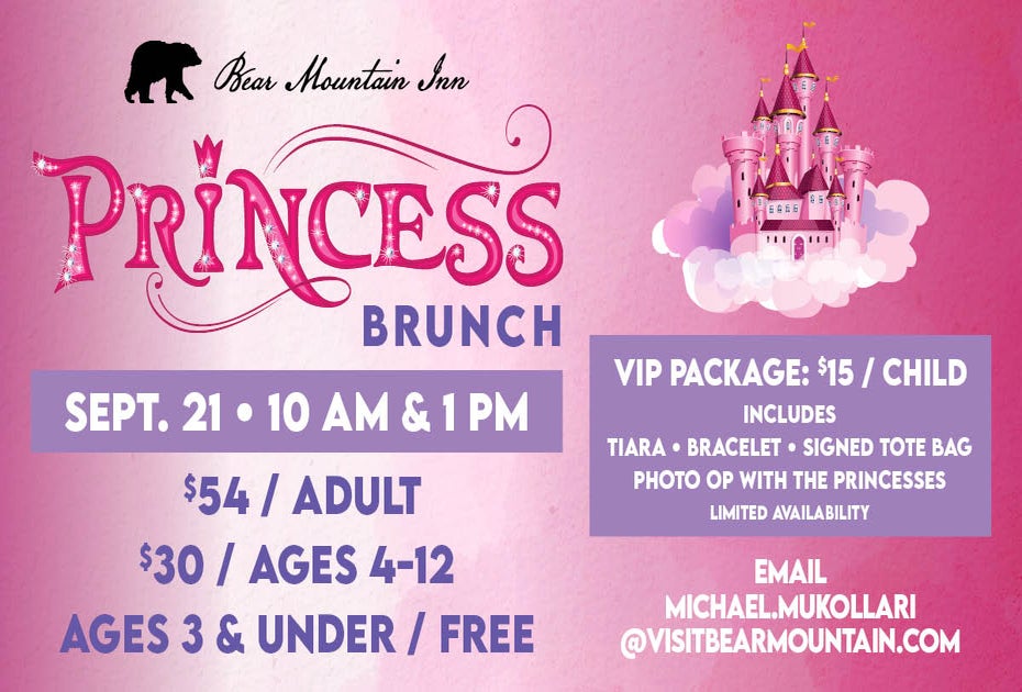 Treat your little ones to a royal experience at the Bear Mountain Inn's Princess Brunch. It’s an unforgettable day filled with delicious food, enchanting princesses, and VIP memories your kids will cherish forever. Ticket includes brunch, magical drinks for kids, and cocktails for adults.