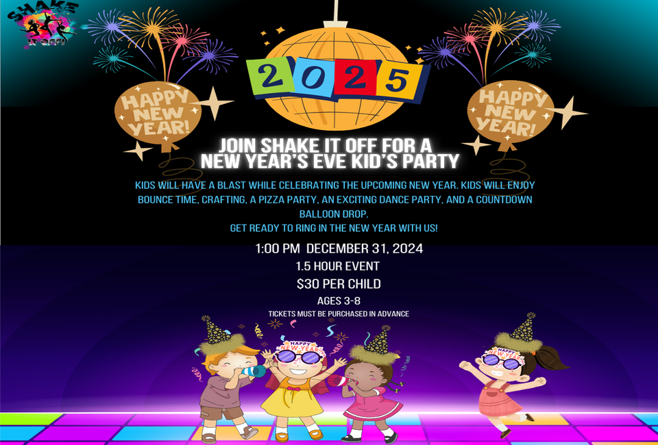 Kids can ring in the new year at Shake it Off with bounce houses, crafting, a dance and pizza party, and a countdown to a balloon drop.