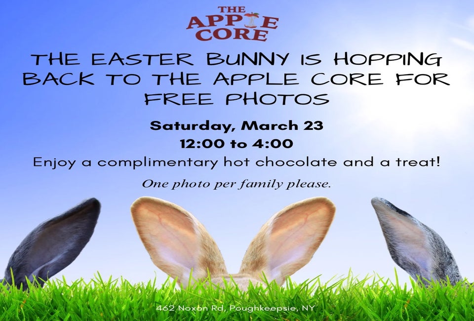 Stop by the farm market at the Apple Core by Barton Orchards to enjoy Easter Bunny pictures. Bring your own camera to snap a photo and enjoy complimentary hot chocolate and an Easter treat.