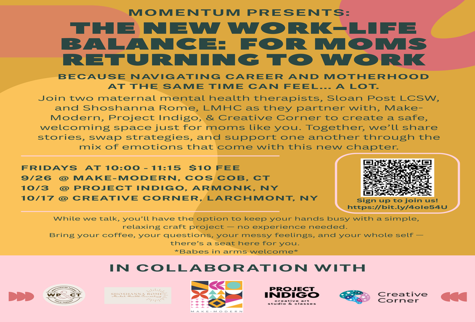 Join two maternal mental health therapists, Sloan Post LCSW, and Shoshanna Rome, LMHC as they partner with Creative Corner to create a safe, welcoming space just for moms like you. Together, participants will share stories, swap strategies, and support one another through the mix of emotions that come with this new chapter.