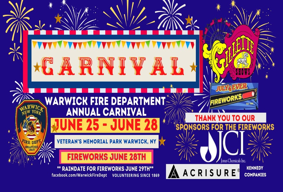 Carnival is rain or shine. Rain date for fireworks is Sunday June 29.