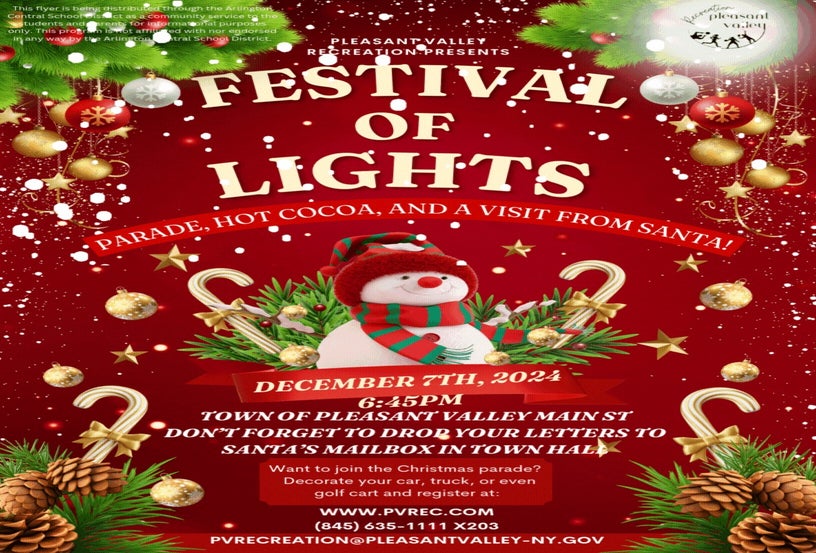 Pleasant Valley Recreation presents the Festival of Lights, featuring a parade of floats decorated with lights and music, hot chocolate, and a visit from Santa himself! And don't forget to drop off your letter to the North Pole in the mailbox at the Town Hall.