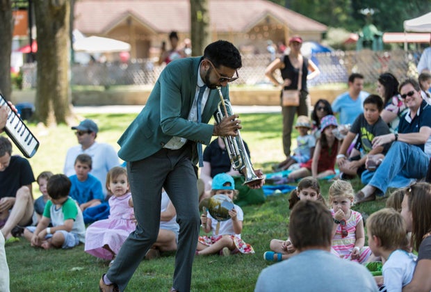 While some concert-goers plant themselves in one area throughout their visit, we’ve preferred to bop around to sample the different artists for a primer on varying jazz styles. In 2016, we began by laying out our blanket under a tent on the great lawn of the Friends Field for The Gotham Kings, a New Orleans-style jazz band that was heavy on horns and featured a dedicated tap dancer wearing bright red shoes. Before that ended, we relocated to the Sunken Garden for an up-close performance by the Eddie Barbash Band, whose style integrated elements of bluegrass; there, my kids could run around the garden within earshot of the music but without disrupting the cozy cluster of audience members. In the Outdoor Amphitheater, we sat on folding chairs under the large roof for the Evan Sherman Big Band.
