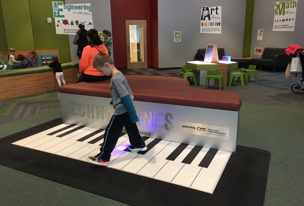 A giant floor piano, Big-style, lets kids stomp some music with their feet. There’s also a “Wonder Wheel” display with simple machines—kids use levers, wheels and gears to move a few balls—but it was unfortunately out of commission the day we visited. A bit of a bummer for my 5-year-old, but it looks easily fixable.