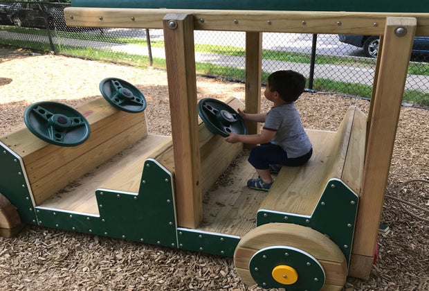 Right next to that play structure is a sand area. It’s not enclosed, so be mindful if you’re looking to keep sand out of the car (and your kid’s shoes). It was already stocked with some buckets and shovels, and it features a little house for creative play, as well as a wooden table and “chairs.” The best part—at least according to my all-things-construction-loving toddler—were the small, ride-on excavators that pick up sand. While they were a little heavy for his age, it would be ideal for a preschooler.