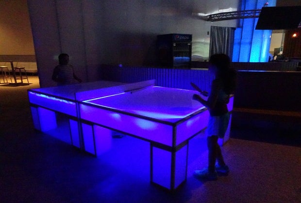 Ping-pong takes on new dimensions with four-way and glow-in-the-dark tables. Photo taken by the author.
